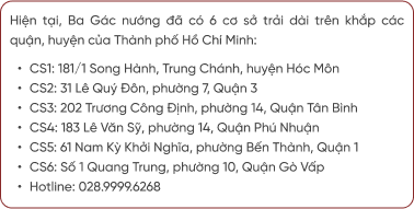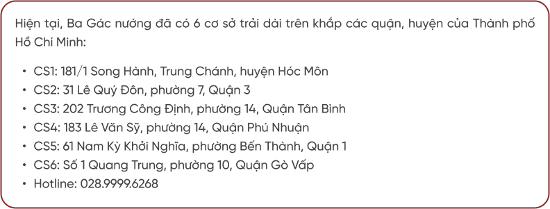 nMô hình như Ba Gác nướng cần nằm trên đường lớn, mặt bằng rộng, tầm 15-18m bề mặt, diện tích cũng rơi vào tầm 500m2 thì mới đảm bảo được độ nhận diện và quy mô cho quán, cũng như tăng khả năng tiếp cận với khách hàng. Ngoài những yếu tố chính đó ra thì còn phải đánh giá thêm về yếu tố phụ như: đường có dễ đi không, có đảm bảo an ninh không, khi triều cường lên thì có bị ngập không,... Mất khoảng 4 5 tháng chọn lựa, tới tháng 6/2017 thì cơ sở 2 của Ba Gác nướng mới chính thức đi vào hoạt động.n