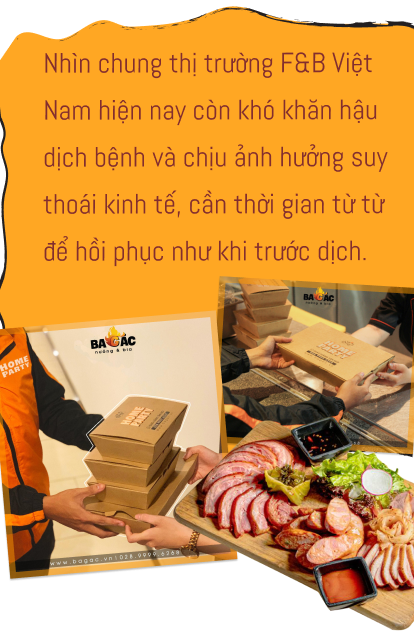 nNgược lại, Ba Gác nướng theo mô hình lớn hơn, cần mặt bằng rộng; cái mà thương hiệu bán cho khách không chỉ là đồ ăn mà còn là sự hài lòng, vui vẻ khi được tới quán ngồi lai rai vài chai bia vài món nhắm với bạn bè, đồng nghiệp. Dịch dã làm ảnh hưởng khá nhiều tới hoạt động của Ba Gác nướng, bọn anh không thể hoàn toàn chuyển đổi sang bán hàng online được mà chỉ có thể coi nó như một phương án duy trì trong dịch mà thôi, ví dụ như bán đồ ăn trưa online để giúp anh em trong công ty có thêm thu nhập,...