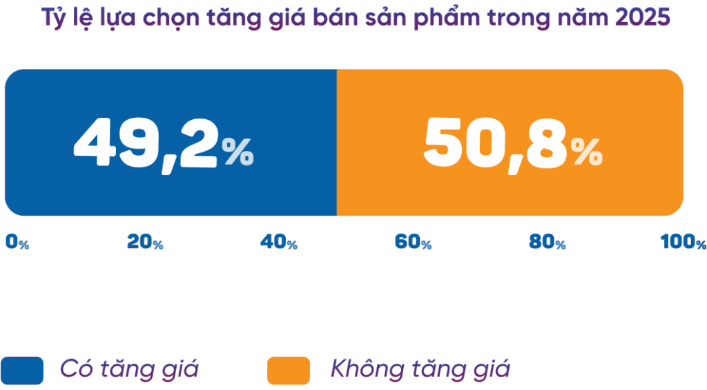 Năm 2025, 49,2% doanh nghiệp F&B tại Việt Nam sẽ quyết định tăng giá sản phẩm để đối phó với áp lực chi phí nguyên vật liệu tăng cao. Như đã phân tích, giá nguyên liệu đầu vào đã tăng mạnh trong thời gian qua, cộng với các yếu tố chi phí khác như lương cơ bản tăng từ 1/7/2024 và chi phí thuê mặt bằng leo thang do sự gia tăng của giá bất động sản.