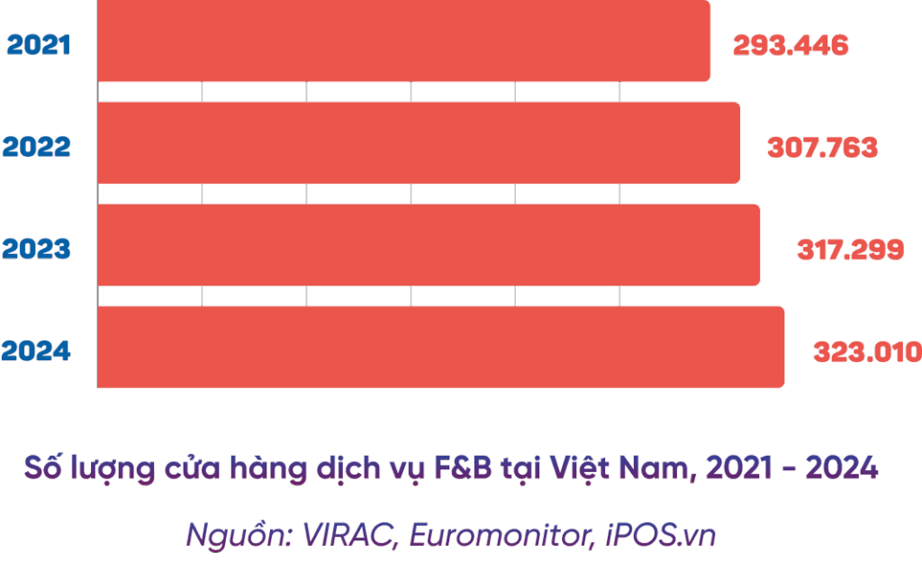 Năm 2024, số lượng cửa hàng F&B tại Việt Nam ước tính đạt 323.010 cửa hàng, tăng 1,8% so với cùng kỳ năm trước. Tuy nhiên, mức tăng trưởng này vẫn thấp hơn đáng kể so với năm 2023 (3,1%), cho thấy thị trường vẫn đang trong giai đoạn điều chỉnh sau thời kỳ khó khăn.