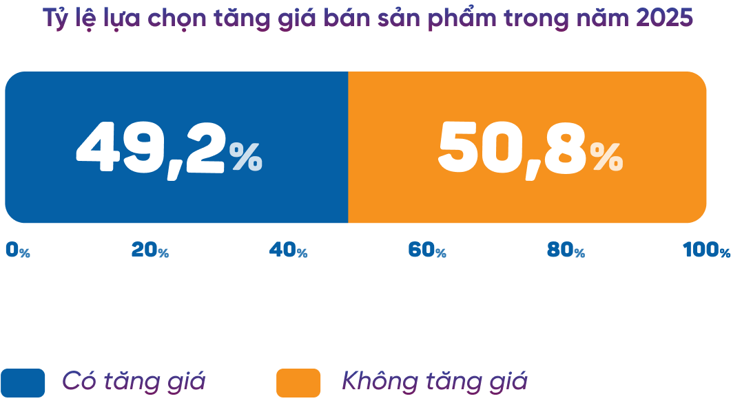 Năm 2025, 49,2% doanh nghiệp F&B tại Việt Nam sẽ quyết định tăng giá sản phẩm để đối phó với áp lực chi phí nguyên vật liệu tăng cao. Như đã phân tích, giá nguyên liệu đầu vào đã tăng mạnh trong thời gian qua, cộng với các yếu tố chi phí khác như lương cơ bản tăng từ 1/7/2024 và chi phí thuê mặt bằng leo thang do sự gia tăng của giá bất động sản.