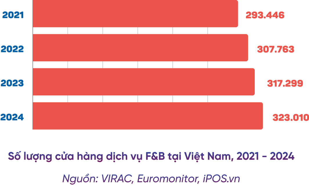 Năm 2024, số lượng cửa hàng F&B tại Việt Nam ước tính đạt 323.010 cửa hàng, tăng 1,8% so với cùng kỳ năm trước. Tuy nhiên, mức tăng trưởng này vẫn thấp hơn đáng kể so với năm 2023 (3,1%), cho thấy thị trường vẫn đang trong giai đoạn điều chỉnh sau thời kỳ khó khăn.
