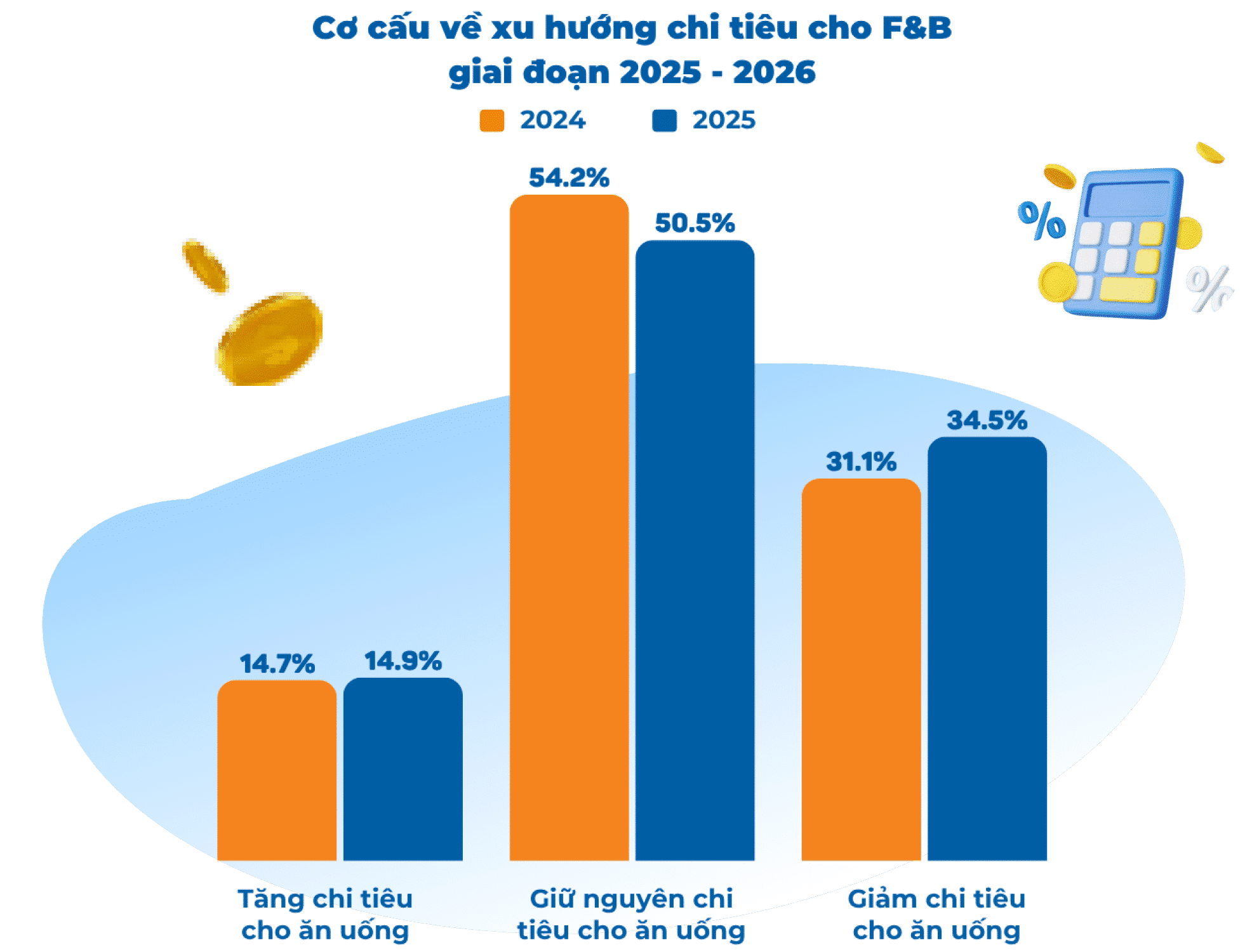 Thực khách Việt đang nhìn về tương lai với thái độ bi quan hơn rõ rệt. Khảo sát cho thấy tỷ lệ người dự kiến giảm chi tiêu cho ăn uống trong năm 2026 đã tăng lên mức 34,5% (so với 31,1% của năm trước), trong khi nhóm giữ nguyên chi tiêu cũng suy yếu. Điều này dự báo năm 2026 sẽ là một cuộc cạnh tranh khốc liệt hơn để doanh nghiệp giữ chân khách hàng thông qua giá trị thực chất thay vì mở rộng ồ ạt.
