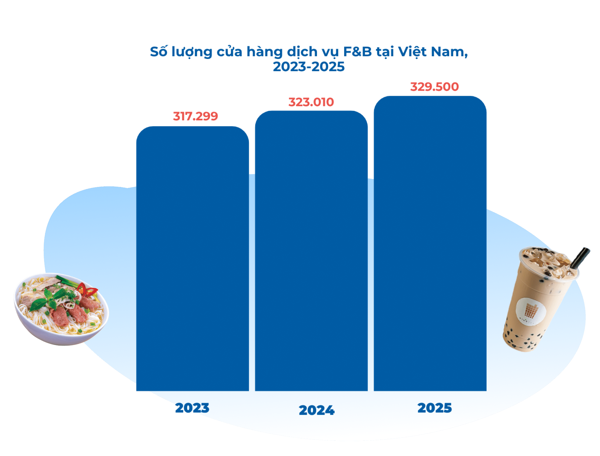 Tốc độ mở rộng của ngành F&B năm 2025 có xu hướng chậm lại khi ghi nhận tăng trưởng 2,0% so với năm 2024, đạt mốc 329,500 cửa hàng. Mức tăng trưởng này được đánh giá khá thấp so với giai đoạn phục hồi năm 2023 (3,1%) và năm 2022 (4,9%). Nửa đầu năm 2025, thị trường chứng kiến 50.000 cửa hàng F&B rút lui khỏi thị trường do áp lực về chi phí. Điều này khiến tổng số điểm bán giảm xuống còn 299.990 vào cuối quý II trước khi phục hồi nhẹ và cuối năm.