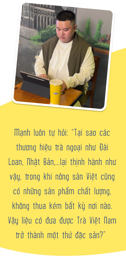 Từ niềm đam mê tới việc được đào tạo bài bản, Mạnh có định hướng nghề nghiệp rõ ràng. Năng lực chuyên môn và mạng lưới nghề nghiệp cần được phát triển hơn nữa, cậu quyết định đầu tư thời gian, công sức chuyên sâu hơn về ngành trà. Mạnh xin làm ở 1 thương hiệu trà khá có tiếng ở Việt Nam thời đó, với mục tiêu được học thêm nhiều về trà: vị trà, nguồn gốc và những khu vực trồng trà khác nhau,...