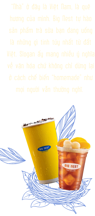 Năm 2019, thời điểm Big Nest ra đời, thị trường Việt Nam đã rất thịnh hành những thương hiệu trà sữa ngoại, đặc biệt các dòng trà từ Đài Loan. Điểm khác biệt đầu tiên của Big Nest là mọi nguyên liệu đều 100% từ nông sản Việt. Ngay cả trân châu, Big Nest cũng lấy nguồn từ tinh bột khoai mì ở Tây Ninh chứ không nhập từ nước ngoài.