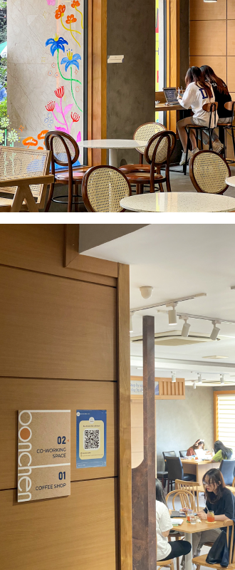 nTầng 1 là mô hình quán cà phê tập trung vào không gian thoải mái, đồ uống độc đáo và đồ ăn nhẹ thơm ngon. Trong khi đó, tầng 2 sẽ là khu vực yên tĩnh dành riêng để mọi người học tập, làm việc. Đặc biệt, những dụng cụ cần thiết nhất để khách hàng có thể thư thả một ngày dài cũng được bố trí đầy đủ trên các kệ tủ tại Bonchen. Có giấy, có bút, có sách,... và có cả vật dụng cần thiết “ngày đèn đỏ” cho các bạn nữ nữa. Tất cả đều miễn phí để tạo cảm giác thoải mái nhất!n