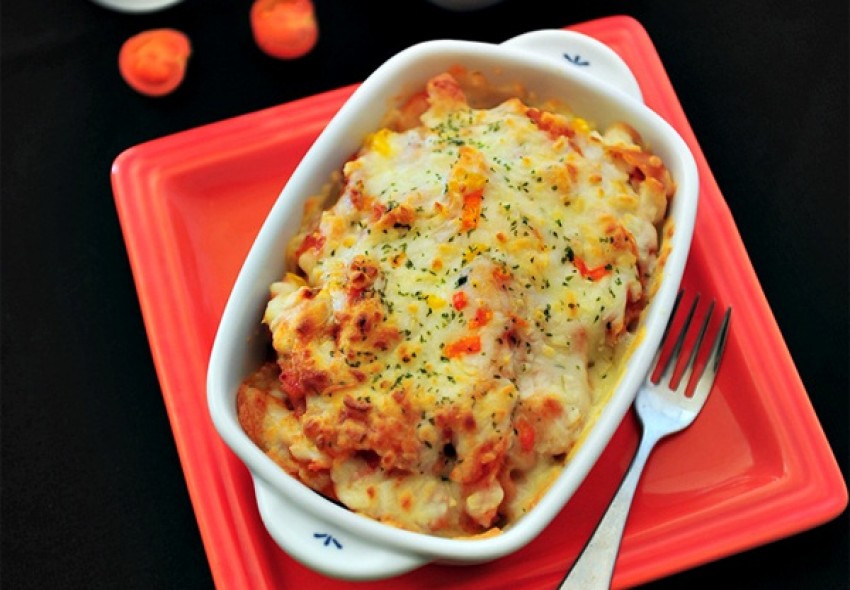 Cho nui vào khay hoặc bát thủy tinh, đổ sốt phủ lên rồi trộn đều để nui ngấm sốt. Rải bên trên 1 lớp phô mai mozzarella, 1 lớp mỏng phô mai parmesan rồi cho khay nui vào lò nướng, để ở nhiệt độ 250 độ C trong vòng 7-10 phút. Khi thấy phô mai chảy hết và có một vài chỗ cháy xém là có thể đem ra khỏi lò và thưởng thức.