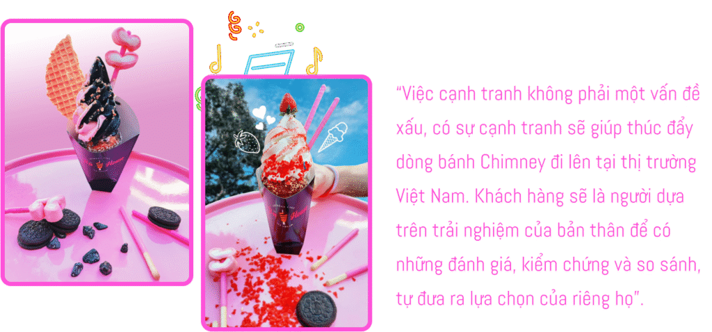 Tiếp theo, chị thấy kem tươi là mặt hàng chưa bao giờ “thất thế” trong thị trường F&B. Khách hàng ở mọi độ tuổi đều thích ăn kem, đây là sản phẩm được số đông khách hàng đón nhận. Vì thế, chị tin là bánh Chimney sẽ khó mà “lỗi thời” hay “sớm nở, chóng tàn”.