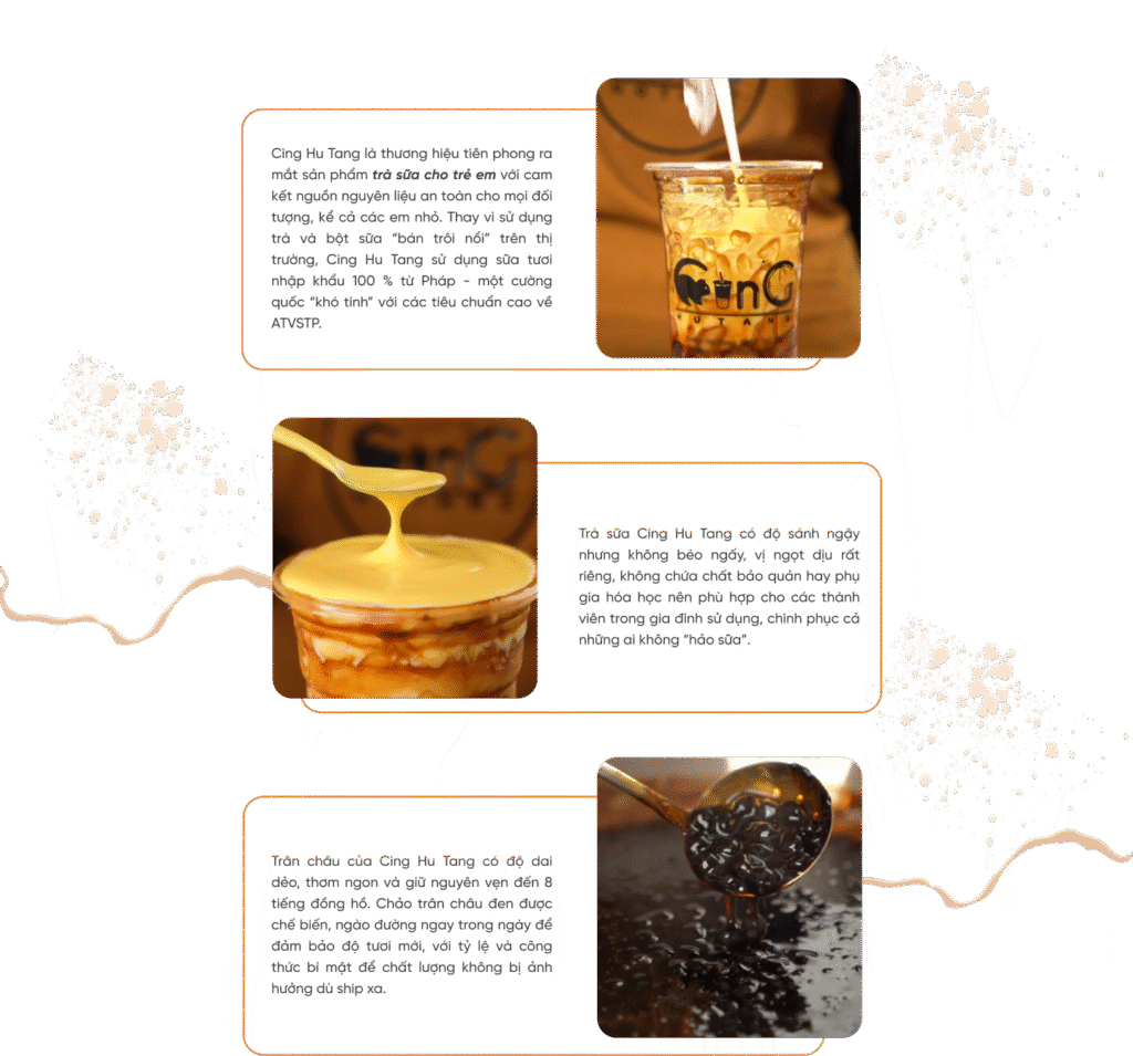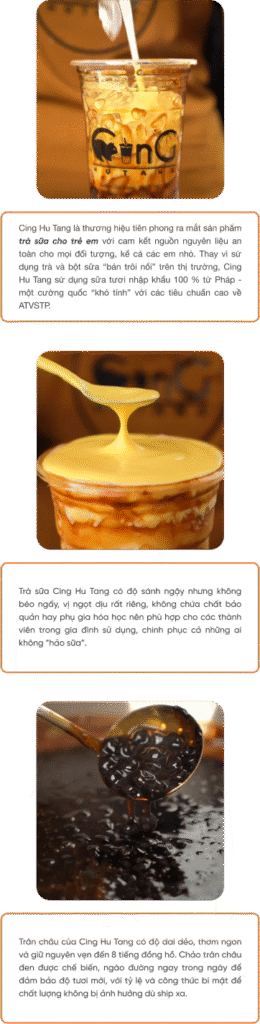 Cing Hu Tang là chuỗi trà sữa từng “làm mưa làm gió” khắp mạng xã hội. Tưởng như chỉ là một “làn gió mới” thổi vào thị trường trà sữa Việt, thế nhưng Cing Hu Tang ngày càng khẳng định vị thế trong lòng khách hàng và chiếm trọn lòng tin phía đối tác. Đến nay, Cing Hu Tang đã có mặt tại hầu hết các tỉnh thành nước ta.
