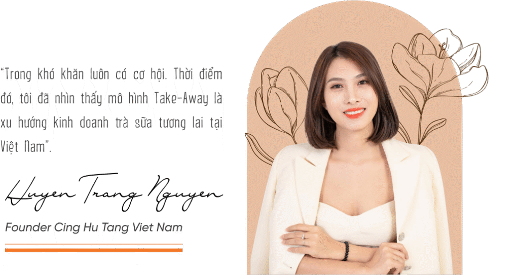 nTrong khi các cửa hàng khác còn loay hoay thích ứng với đại dịch, Cing Hu Tang đã hoàn thiện sản phẩm và tiên phong bán trà sữa mang về. Chia sẻ về hướng đi mới mẻ này, Founder Cing Hu Tang cho biết: “Tôi đã nhìn thấy cơ hội ngay trước mắt. Khi hầu hết các thương hiệu đang khá chú trọng vào không gian check-in, Cing Hu Tang lại tập trung phát triển sản phẩm, đóng gói bao bì, có thể mang đi xa mà chất lượng vẫn giữ nguyên vẹn. Mô hình Take-Away sẽ là chuyển dịch tương lai của ngành trà sữa. Đại dịch chỉ là cú huých cho quá trình này diễn ra nhanh hơn mà thôi!”.n