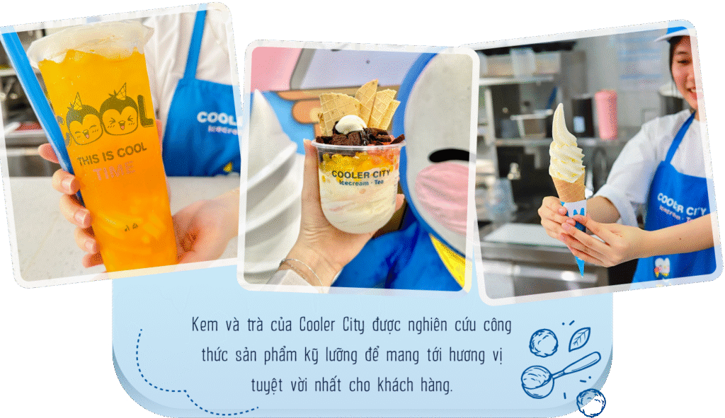 nĐội ngũ của anh đã mất gần 1 năm để nghiên cứu sản phẩm và quy trình vận hành, đến các cửa hàng Cooler City bên Trung Quốc để trao đổi với các chủ quán, đồng thời mang nguyên liệu về test, làm đi làm lại rất nhiều lần. Sau khi đã hiểu rõ cách thức hoạt động kinh doanh cũng như tự tin về hương vị của sản phẩm, bọn anh mới quyết định đầu tư và quyết tâm “chiến hết mình” với dự án lần này.