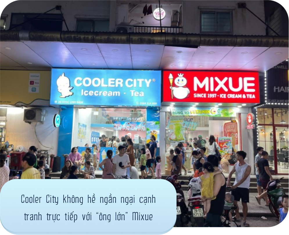 Giống như các cửa hàng The Coffee House mở ngay cạnh Highlands Coffee, Cooler City không hề lo sợ mà hoàn toàn đầy đủ tự tin để đồng hành đứng cạnh hoặc đối diện Mixue. Đó cũng là một lời “tuyên ngôn” rằng Cooler City không ngần ngại, sẵn sàng vừa cạnh tranh trực tiếp với Mixue, vừa đồng hành cùng Mixue như người anh em để cùng phục vụ khách hàng. Thậm chí, mở những cửa hàng có mặt bằng như vậy còn an toàn vì tận dụng được lưu lượng khách hàng sẵn có. Cả hai bên cùng kinh doanh, cùng san sẻ doanh thu, cùng vui, đó là câu chuyện tốt mà! *cười*