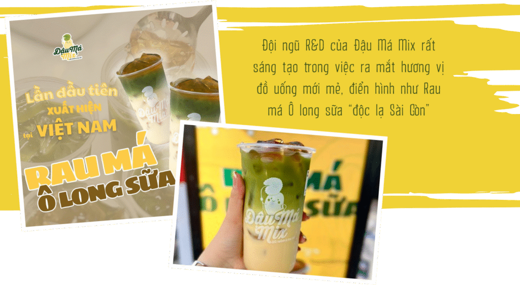 Nếu như sự kết hợp giữa đậu nành và rau má khá gần gũi và quen thuộc thì menu Ô long sữa của Đậu Má Mix lại là một phá cách mới. Đậu Má Mix đã khéo léo để đưa dòng sản phẩm Ô long sữa “trendy” vào menu của mình mà rất hài hòa chứ không hề khiên cưỡng. Rau má Ô long sữa, Sương sáo Ô long sữa,... đều nhận được phản hồi tích cực từ phía khách hàng. Ngoài ra, gần đây nhất là bên anh có Nành sữa cốm non, Má sữa cốm non - những sự kết hợp nguyên liệu từ đa dạng vùng miền khác nhau để mang đến trải nghiệm mới mẻ cho khách hàng.