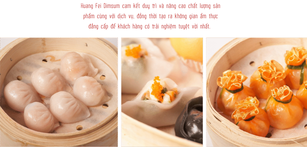 Ví dụ, chúng tôi hiểu rõ người miền Bắc Việt Nam thích ẩm thực thanh đạm nên đã điều chỉnh một số thành phần nguyên liệu để đảm bảo rằng đồ ăn phần nào thỏa mãn được vị giác của khách hàng. Đồng thời, Huang Fei Dimsum cũng tạo ra một menu đa dạng, từ đồ hấp đến đồ chiên, từ dimsum truyền thống đến những món dimsum mùa lễ hội, bắt kịp xu hướng thị trường hiện nay.