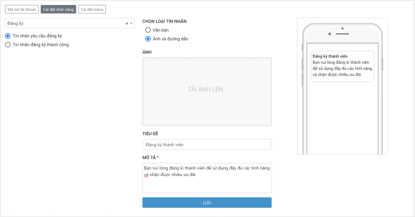 Bước 3: Chọn Tin nhắn đăng kí thành công > Chọn loại tin nhắn Ảnh và đường dẫn > Thêm ảnh, sửa Tiêu đề, Mô tả > Lưu