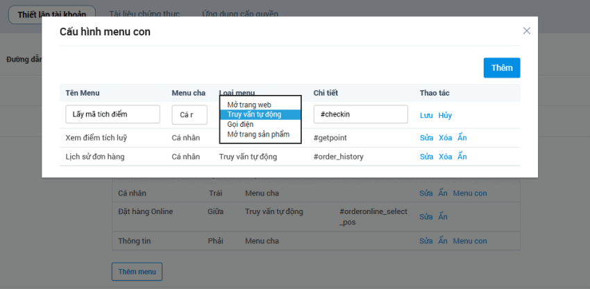 Bước 4: Chọn menu con > Thêm menu con > Nhập tên menu > Chọn loại menu > Nhập chi tiết phù hợp > Ấn Lưu