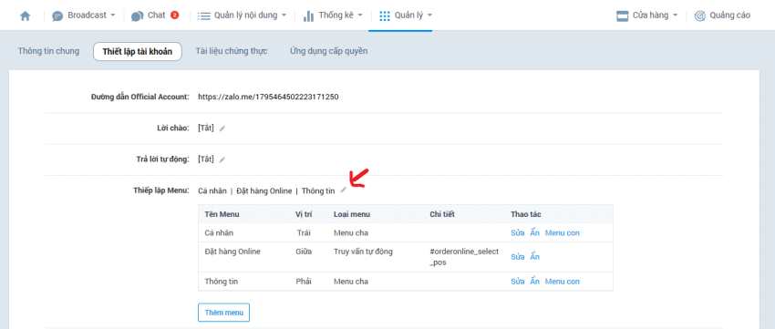Bước 1: Truy cập OA Zalo > Quản lý > Thông tin tài khoản > Thiết lập tài khoản