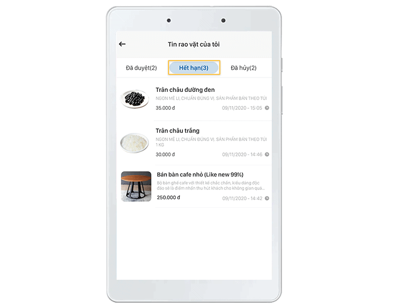 Hết hạn: Mỗi một tin được cho phép hiển thị mặc định trên Tin rao vặt 7 ngày kể từ ngày được duyệt. Hết thời hạn trên tin sẽ tự động chuyển vào mục Hết hạn và không hiển thị trên Tin rao vặt. Muốn đăng lại tin bạn vào chọn tin và chọn Đăng lại tin. Khi đó, tin sẽ tự động đăng lại và hiển thị trong mục Đang bán mà không cần kiểm duyệt lại.