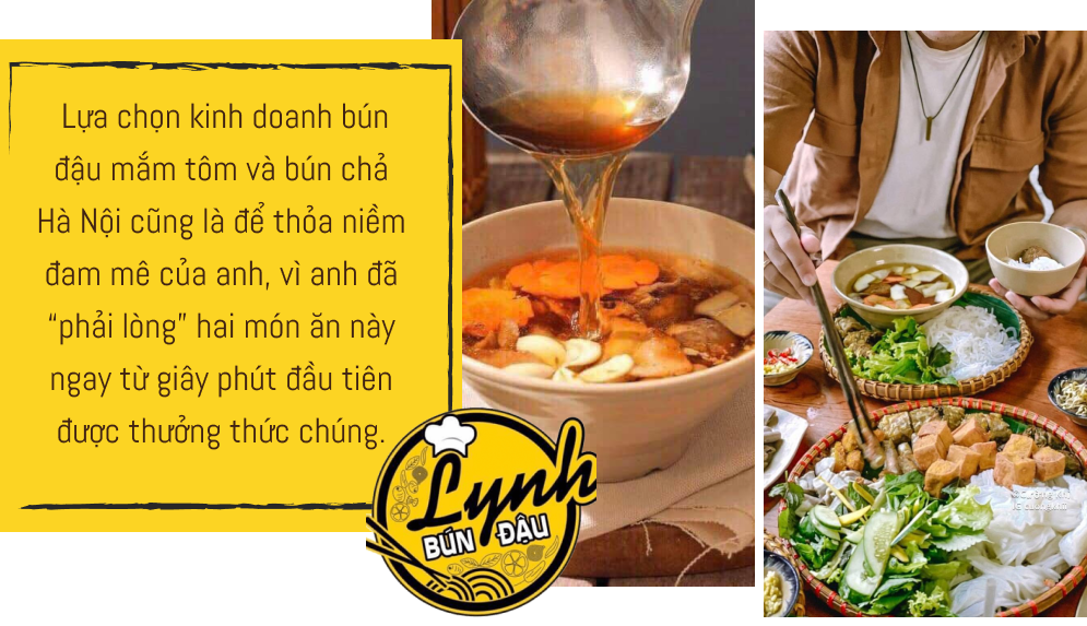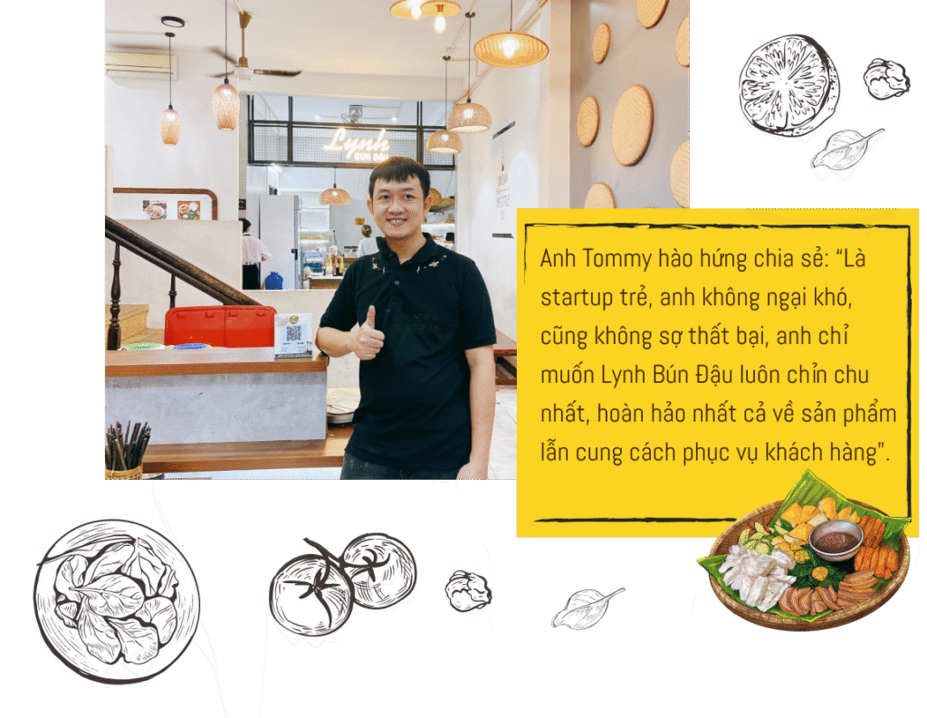 nCàng ấn tượng hơn nữa khi tôi biết được người đứng sau thành công ấy của Lynh Bún Đậu lại là một chàng trai trẻ miền Nam với niềm yêu thích đặc biệt dành cho ẩm thực miền Bắc, và chính niềm yêu thích ấy đã thôi thúc anh Tommy từ một kỹ sư “rẽ ngang” sang startup trong ngành F&B. Tuy rằng không thể gặp mặt trực tiếp, nhưng qua màn hình video call, tôi vẫn thấy sự đam mê và lòng nhiệt huyết bừng sáng trong đôi mắt anh khi nhắc tới “đứa con tinh thần” Lynh Bún Đậu.n
