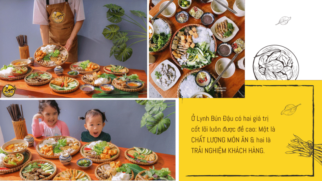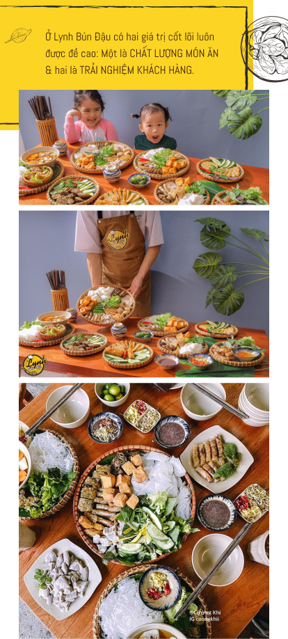 nGiá trị cốt lõi thứ hai là dịch vụ. Anh muốn khi khách tới ăn, họ không chỉ thưởng thức ẩm thực không thôi mà còn được cảm nhận sự thoải mái, vui vẻ với mỗi phút giây ở quán. Để làm được điều đó, Lynh Bún Đậu đã xây dựng một chính sách chăm sóc khách hàng chu đáo, toàn diện, luôn đáp ứng yêu cầu của khách và sẵn sàng lắng nghe những phản hồi dù tốt hay xấu từ phía khách hàng.