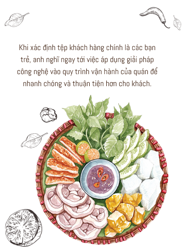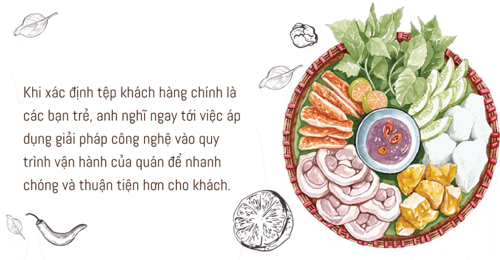 nKhi mở quán, anh xác định tệp khách hàng chính của mình sẽ là các bạn trẻ, chiếm tới khoảng 70% tổng lượng khách tới quán. Tâm lý của tệp khách hàng này rất cởi mở, thích nghi nhanh với công nghệ, tuy nhiên họ cũng yêu cầu rất cao ở chất lượng dịch vụ khi đi ăn. Vì thế, anh đã nghĩ ngay tới việc áp dụng giải pháp công nghệ tiện lợi như Menu điện tử iPOS O2O vào quy trình vận hành của quán để giảm thời gian chờ đợi của khách cũng như tăng năng suất phục vụ.n
