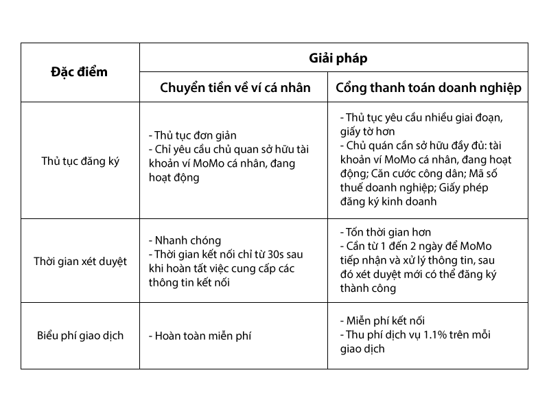 Về cơ bản, giải pháp của MoMo hỗ trợ chủ các thương hiệu nhận và chuyển tiền giao dịch của nhà hàng/quán cafe ngay trên ví MoMo cá nhân. Đi sâu hơn vào chi tiết, giải pháp có những điểm khác biệt (và cũng là lợi ích) so với Cổng thanh toán danh cho doanh nghiệp của MoMo như sau: