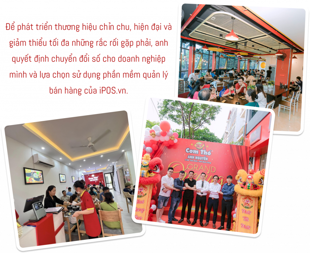 Để phát triển thương hiệu chỉn chu, hiện đại và giảm thiểu tối đa những rắc rối gặp phải, anh quyết định chuyển đổi số cho doanh nghiệp mình và lựa chọn sử dụng phần mềm quản lý bán hàng của iPOS.vn. Anh tin rằng, nếu không có sự hỗ trợ từ công nghệ, suy nghĩ của con người sẽ còn bị hạn chế hơn rất nhiều. Thay vì phải tự kiểm tra từng cửa hàng một cách thủ công, các cơ sở Cơm Thố Anh Nguyễn đã bắt đầu sử dụng các hệ thống máy móc trung gian trong quy trình vận hành của mình.