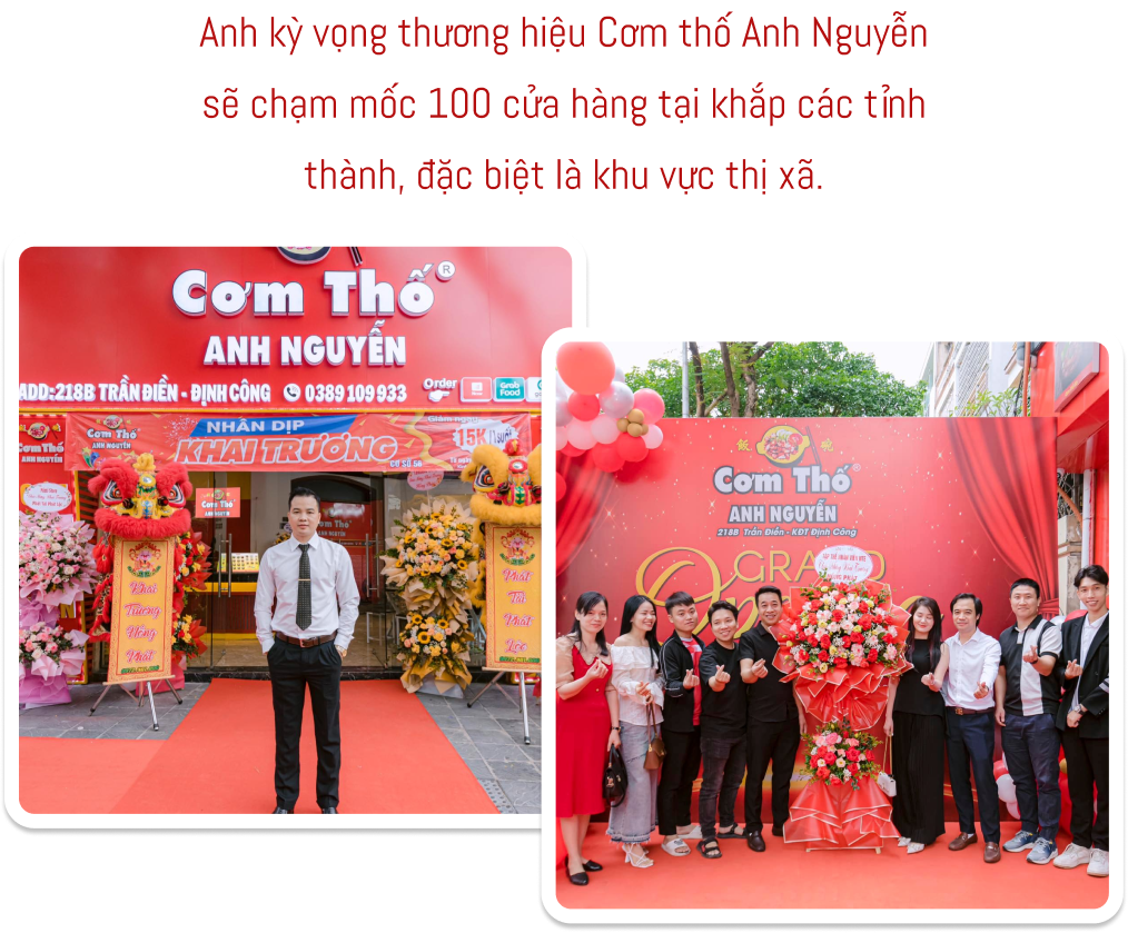 Cho đến đầu năm 2024, với hai hình thức song song: tự mở chi nhánh và kết hợp nhượng quyền cho đối tác có nhu cầu, anh kỳ vọng thương hiệu Cơm Thố Anh Nguyễn sẽ chạm mốc 100 cửa hàng tại khắp các tỉnh thành, đặc biệt là khu vực thị xã.
