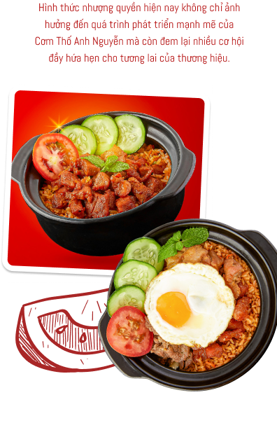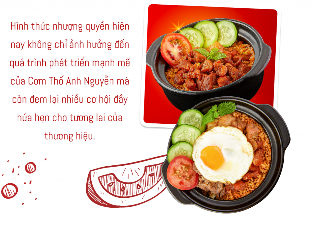 Hơn thế, việc mở rộng phạm vi địa lý thông qua việc nhượng quyền cũng giúp thương hiệu tiếp cận gần hơn với nhiều khách hàng tiềm năng, từ đó tạo ra mức độ nhận diện rộng rãi của Cơm Thố Anh Nguyễn tại những khu vực khác nhau, giúp tăng cường niềm tin và lòng trung thành của khách hàng đối với thương hiệu.
