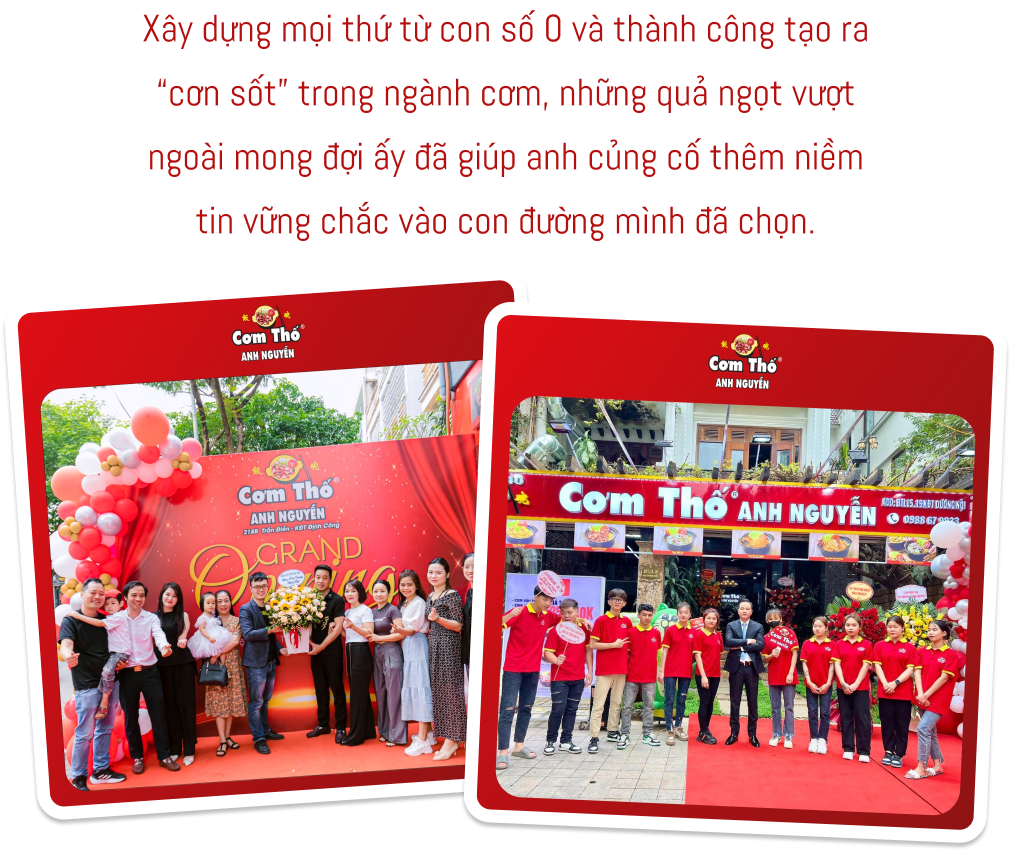 Xây dựng mọi thứ từ con số 0 và thành công tạo ra “cơn sốt” trong ngành cơm, những quả ngọt vượt ngoài mong đợi ấy đã giúp anh củng cố thêm niềm tin vững chắc vào con đường mình đã chọn. Không tập trung quá nhiều vào việc truyền thông mà hơn hết là nhờ cách thức truyền miệng của khách hàng thân thiết, vì lẽ đó nên hình ảnh Cơm Thố Anh Nguyễn dường như đã đi sâu vào trong lòng những tín đồ đam mê ẩm thực chốn Hà Thành.