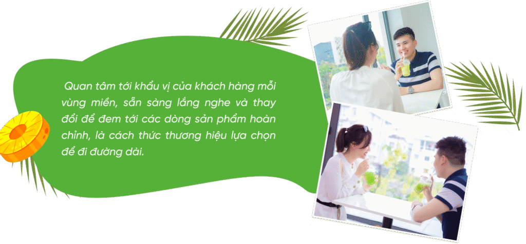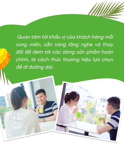 nCác món trên thực đơn hiện tại đều đã được thương hiệu thử nghiệm trước đó, test giữa 200 khách hàng để lấy ý kiến số đông, đánh giá về chất lượng. Hương vị các đồ uống đều có chỉnh lý theo vùng miền, nhập gia thì tùy tục mà. Chẳng hạn, miền Nam nóng quanh năm và ưa ngọt hơn miền Bắc tầm 30%, nên sản phẩm trong Nam sẽ luôn ngọt và nhiều đá hơn. Còn miền Bắc thì họ chuộng vị thanh ngọt, ít đá hơn. Vào mùa đông tại miền Bắc, thương hiệu cũng luôn luôn không ngừng phát triển những món đồ uống đặc trưng để phù hợp hơn với khí hậu. Nước dừa khi được đi kèm với các loại topping, bản chất sẽ giúp tăng thêm hương vị và nó rất dễ “gây nghiện” cho khách hàng.