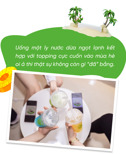 nCòn với dòng đồ uống Nước dừa trân châu thì hoàn toàn khác. Với 100% làm từ trái dừa tươi, giữ nguyên hương vị, dưỡng chất bên trong trái dừa. Được nghiên cứu sử dụng từ nguồn nguyên liệu qua tuyển chọn kỹ lưỡng, với nhiều topping đi kèm đặc sắc, thì khách hàng họ sẽ phải cân nhắc trước khi lựa chọn chứ. nVì thế thương hiệu chắc chắn sẽ là 1 “điểm sáng” của ngành đồ uống trong tương lai.