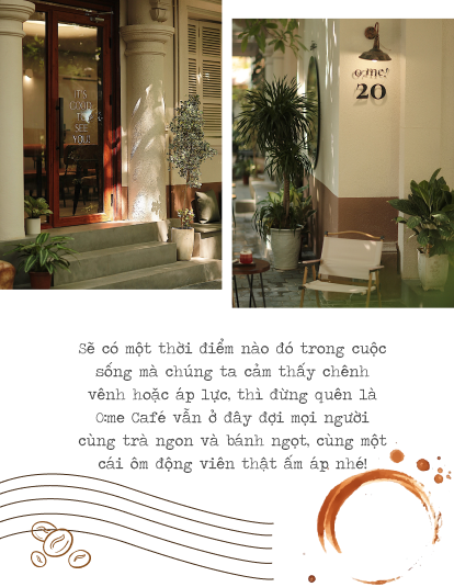 O:me Café nằm sâu trong một con ngõ yên tĩnh, đi theo concept nhẹ nhàng lãng mạn, lại mang cái tên với ý nghĩa “một cái ôm thật chặt” - tạo cảm giác O:me giống như một nơi thích hợp cho những ai đang tìm kiếm sự yên bình, thư giãn, chữa lành cho tâm hồn. Phải chăng đây cũng chính là ý định ban đầu khi chị sáng lập ra O:me Café?