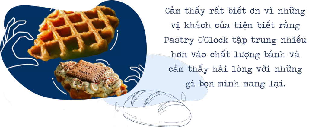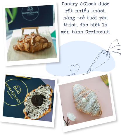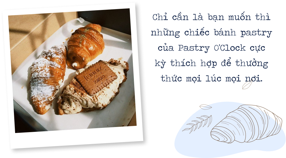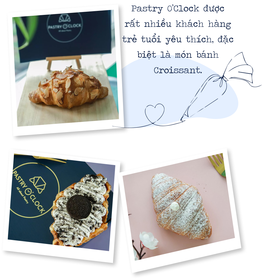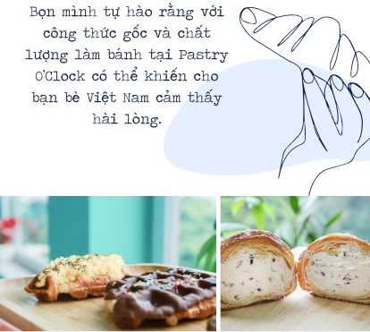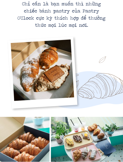 nBọn mình tự hào rằng với công thức gốc và chất lượng làm bánh tại Pastry O’Clock có thể khiến cho bạn bè Việt Nam cảm thấy hài lòng. Và thật may mắn, giống như bọn mình đã kỳ vọng, phần lớn khách hàng Việt Nam đều dành sự yêu thích với món bánh Croissant tại Pastry O’Clock. Hiện tại, khách hàng đã có thể xem những phản hồi, đánh giá về tiệm trên các nền tảng mạng xã hội và ứng dụng đặt đồ ăn có mặt Pastry O’Clock như GrabFood, ShopeeFood, Facebook, Instagram.n