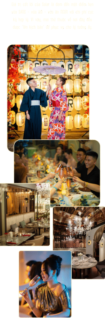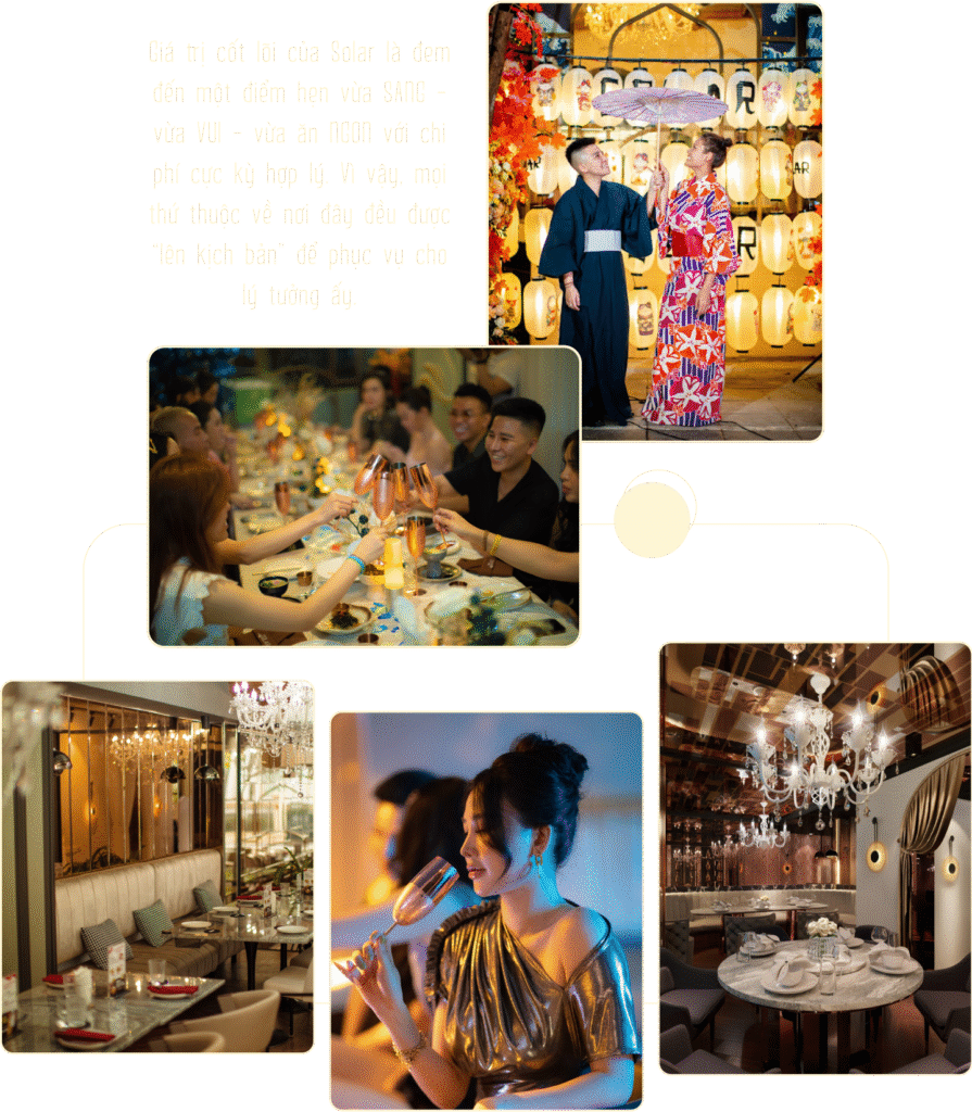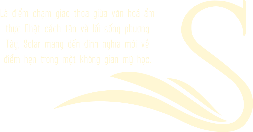 Còn về không gian của Solar thì quả thật anh luôn muốn lan tỏa những gì tốt nhất, đẹp nhất, hoàn thiện nhất đến cho khách hàng. Từ ngoài nhìn vào, mọi người đã có thể cảm nhận vẻ đẹp hiện đại, sang trọng đậm chất Âu của Solar. Và khi bước vào trong, vẻ đẹp ấy sẽ được thể hiện rõ nét hơn qua những chiếc sofa built-in màu champagne kết đôi cùng mặt bàn vân đá, phản chiếu ánh đèn chùm lấp lánh màu pha lê. Tuy vậy, ở một vài chi tiết, vẫn được cân bằng với hơi hướng Á Đông thông qua những khung cửa kính chạm khắc hay cách sửa soạn bàn ăn đặc trưng của người Nhật,...