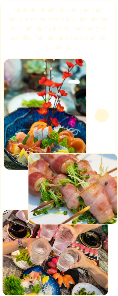 Tuy nhiên, với cương vị là chủ sở hữu vừa kiêm nhiệm người quản lý nên anh cần một phần mềm không những hỗ trợ vận hành nhà hàng mà còn giải quyết được câu chuyện nghiệp vụ back-office như quản lý lãi lỗ, báo cáo doanh thu theo ngày/tuần/tháng, theo dõi hiệu quả kinh doanh của từng món ăn,... Phần mềm của iPOS.vn giúp anh làm được điều đó. Và thêm một điều anh thích ở iPOS.vn nữa là nhân sự rất nhiệt tình, luôn hỗ trợ kịp thời.