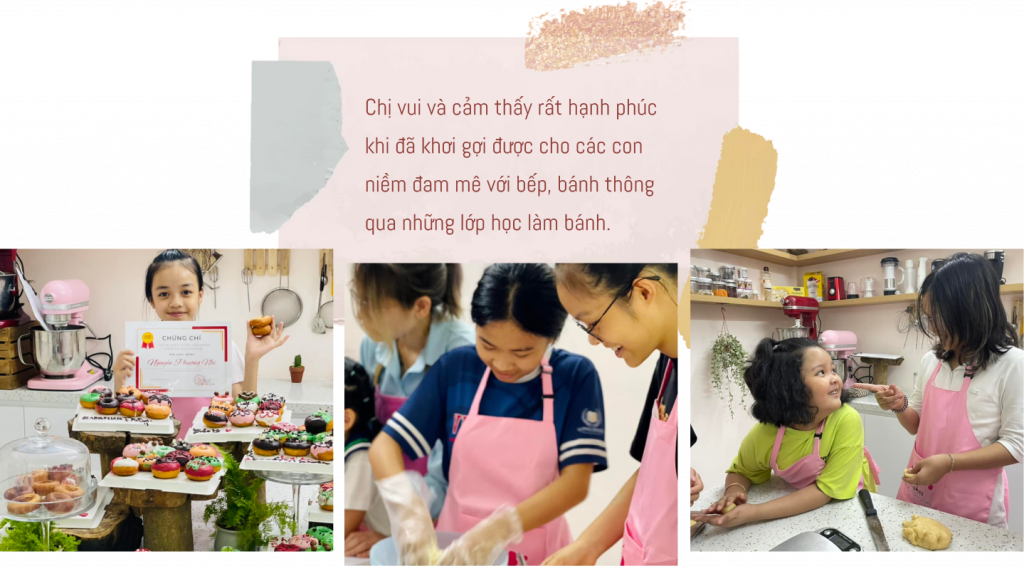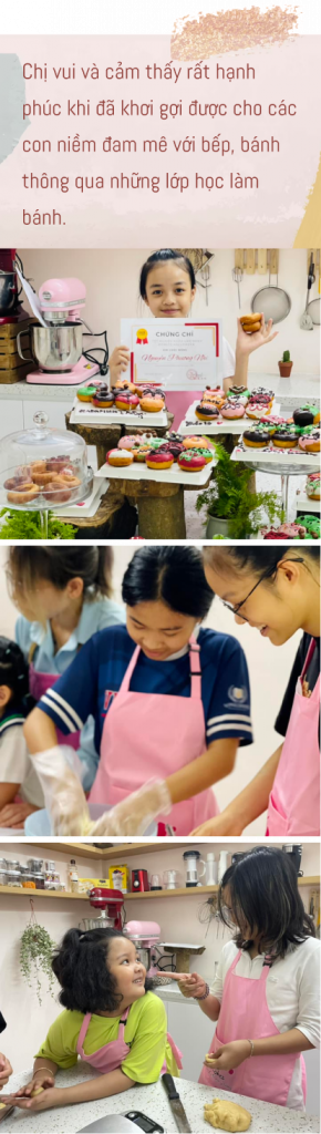 Ngoài kinh doanh bánh ngọt, chị còn mở các lớp dạy làm bánh cho trẻ nhỏ. Dạy làm bánh cho con nít cần rất nhiều công sức và kiên nhẫn, không giống như dạy làm bánh cho người lớn. Vậy điều gì đã khiến chị nảy ra ý tưởng mở lớp dạy làm bánh cho trẻ nhỏ vậy ạ?