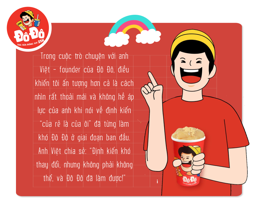 nVà nỗ lực này được đền đáp bằng việc Đô Đô hoạt động ổn định gần 3 năm nay, không ngừng mở rộng quy mô và độ phủ sóng khắp mọi miền đất nước. Tệp khách hàng trung thành của thương hiệu cũng ngày một nhiều thêm, có những người như anh nói là trước đây mang định kiến với trà sữa giá rẻ nhưng dần dần Đô Đô đã giúp họ có cái nhìn khác. Vậy nên anh nghĩ rằng định kiến đúng là khó thay đổi được thật, tuy nhiên không phải là không thể, chỉ cần chúng ta cố gắng và chứng minh định kiến là sai bằng chính chất lượng sản phẩm của mình.