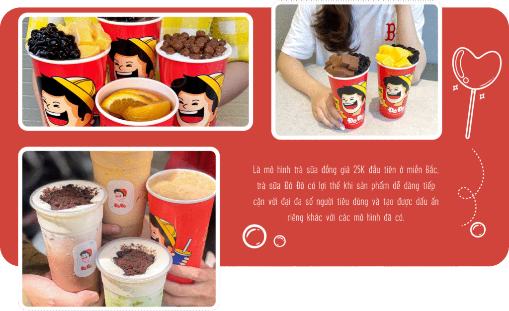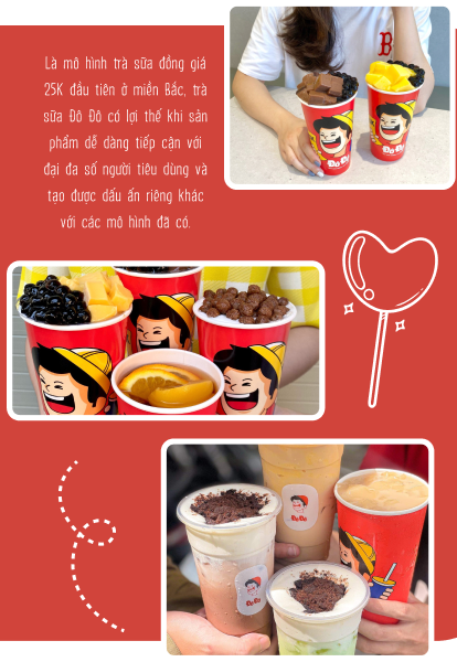 nHiểu được điều này và cũng để khách hàng dễ lựa chọn, Đô Đô đưa tất cả các sản phẩm về cùng một mức giá và khá là thấp - chỉ 25.000 đồng cho 1 cốc trà sữa bất kể loại nào. Mô hình đồng giá giá rẻ như vậy không chỉ giúp khách hàng có thể dễ dàng tiếp cận với sản phẩm mà còn tạo ra dấu ấn riêng cho Đô Đô trên thị trường khi đó.