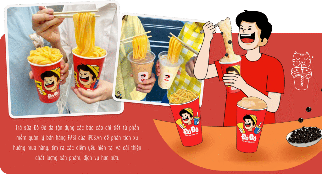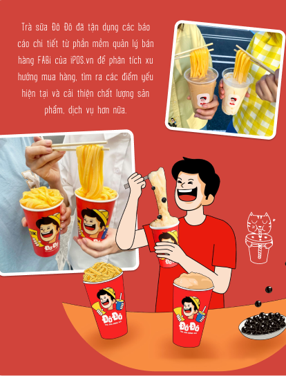 nQua thời gian gắn bó sử dụng thì anh thấy phần mềm quản lý bán hàng FABi là một công cụ hỗ trợ đắc lực mà các doanh nghiệp F&B như bên anh nên có. Từ dữ liệu bán hàng, phần mềm cung cấp cho nhà quản lý rất nhiều báo cáo chi tiết, số liệu cụ thể và có cả biểu đồ trực quan dễ theo dõi về những mục quan trọng như doanh số bán hàng, doanh thu, lượng khách trong một khoảng thời gian, top món bán chạy,... Đô Đô đã tận dụng được những báo cáo này để phân tích xu hướng mua hàng, dự đoán lượng bán ra của các sản phẩm và điểm yếu của thương hiệu; từ đó có thể đưa ra những điều chỉnh kịp thời.