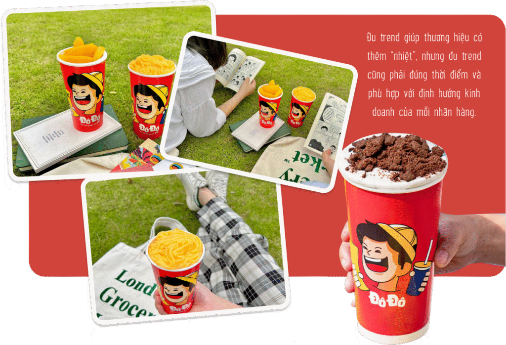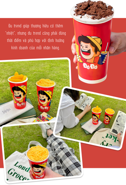 nTuy nhiên, mỗi brand lại có một định hướng riêng và giá trị cốt lõi xuyên suốt, vậy nên trước khi đu trend chúng ta phải cân nhắc xem đu trend có phù hợp với định hướng thương hiệu không, có đúng với phong cách kinh doanh từ trước tới giờ hay không. Ví dụ như một thương hiệu chuyên làm các dòng trà thì thử sức với trà mãng cầu là một lựa chọn khá “matching”, nhưng giờ lại thử một món lạ như cà phê muối hay gộp cả gỏi gà măng cụt vào thì đúng là rất “lạc quẻ”. Hãy coi trend chỉ như một gia vị mới được thêm vào list những món quen thuộc của thương hiệu mà thôi, đừng để nó ảnh hưởng quá nhiều tới định hướng của mình.