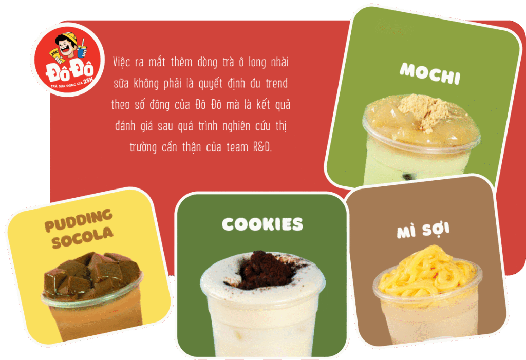 Nhắc tới trend thì hiện tại đang là thời điểm giới trẻ say mê “trà đậm vị”, bằng chứng là hàng loạt thương hiệu đồ uống trên thị trường đã kịp đu trend này và mang lại hiệu quả tích cực. Bên cạnh dòng signature là topping Mochi rất nổi tiếng, Đô Đô liệu có định nghiên cứu để bổ sung thêm dòng “trà đậm vị” vào menu không?