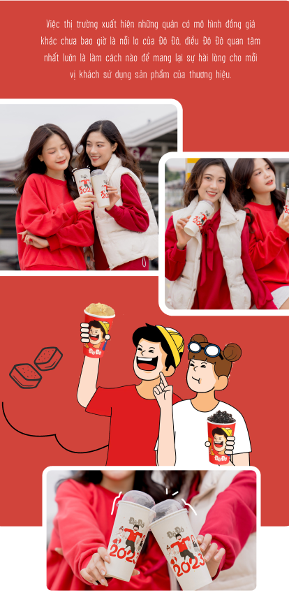 nNếu đến quán của mình mà khách thấy vui, thấy trải nghiệm của họ là đáng giá thì họ chắc chắn vẫn sẽ đến nhiều lần nữa và trở thành tệp khách hàng trung thành của mình. Như vậy thì việc có quán với mô hình tương tự mở ra cũng không phải là điều gì quá ghê gớm nữa. Tất nhiên, Đô Đô cũng sẽ không vì đã có tệp khách hàng trung thành mà chủ quan “giậm chân tại chỗ”, đội ngũ R&D của thương hiệu luôn cố gắng tìm tòi và sáng tạo những sản phẩm mới, thay đổi sản phẩm cũ để khách hàng luôn thấy sự mới mẻ khi đến với Đô Đô.