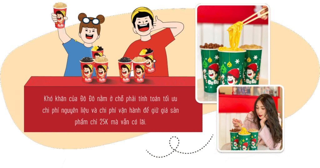 nKhó khăn thứ 2 của Đô Đô là muốn giữ mức giá 25K và thu lợi nhuận thì phải tiết kiệm các chi phí vận hành hết mức có thể, tối ưu toàn bộ quy trình sản xuất từ những khâu nhỏ nhất. Anh tin rằng việc tìm ra đáp án cho câu hỏi “giữ cái gì”, “cắt cái gì”, “giảm cái gì”,... là một vấn đề khó đối với tất cả các doanh nghiệp ở thời điểm hiện tại chứ không riêng gì Đô Đô. Tuy nhiên, khi cắt giảm thì vẫn phải giữ lại những yếu tố quan trọng và cơ bản của thương hiệu, như vậy mới có thể duy trì ổn định hoạt động của toàn chuỗi được.