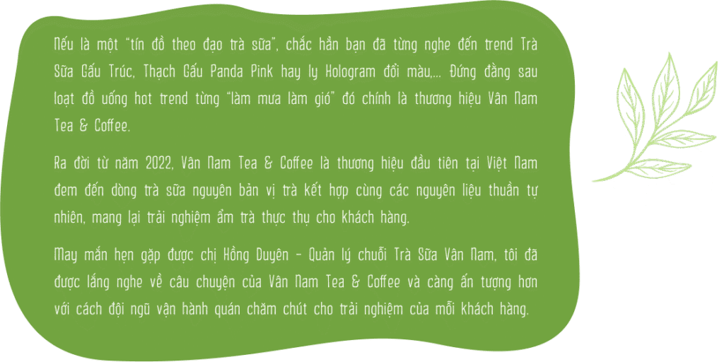 Còn về việc sáng tạo nên những món đồ uống viral thì thực sự Trà Sữa Vân Nam cũng đang trên con đường học hỏi. Đội ngũ Vân Nam Tea & Coffee chỉ luôn quan niệm rằng: Nếu bạn phục vụ khách hàng bằng cái tâm của mình, thì chắc chắn sẽ nhận lại được gia trị tương xứng.