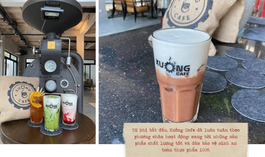 nAnh chị muốn khách hàng nhớ tới Xưởng Cafe không chỉ là một điểm đến để thưởng thức cà phê đơn thuần mà còn như một “Công Xưởng” thực thụ, có thể vừa rang, vừa xay, vừa pha chế cà phê. Ở những cơ sở đầu tiên, thậm chí anh chị còn đặt cả những chiếc máy rang, xay cà phê để khách đến quán được theo dõi quá trình từ lúc chế biến hạt đến khi ra được thành phẩm là ly cà phê tới tay khách như thế nào.n