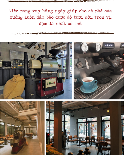 nVới cách làm của Xưởng Cafe thì sẽ không thể có những lợi thế như các chuỗi lớn, nhưng bù lại Xưởng có thể đảm bảo được độ tươi mới của cà phê khi nhập và chế biến theo lô nhỏ như vậy. Hơn nữa, khi rang thủ công theo lô nhỏ thì Xưởng cần rang liên tục, thời gian cà phê đã qua chế biến phải lưu trữ là rất ngắn, như vậy Xưởng có thể hạn chế đến mức thấp nhất việc phải sử dụng các chất bảo quản trên cà phê.n